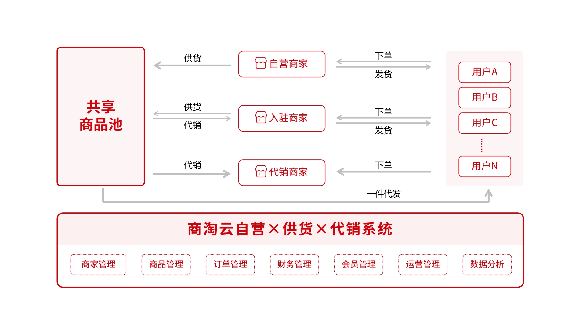 商淘云系统的核心优势在于打通了“自营+供货+代销”三大场景,形成闭环生态。